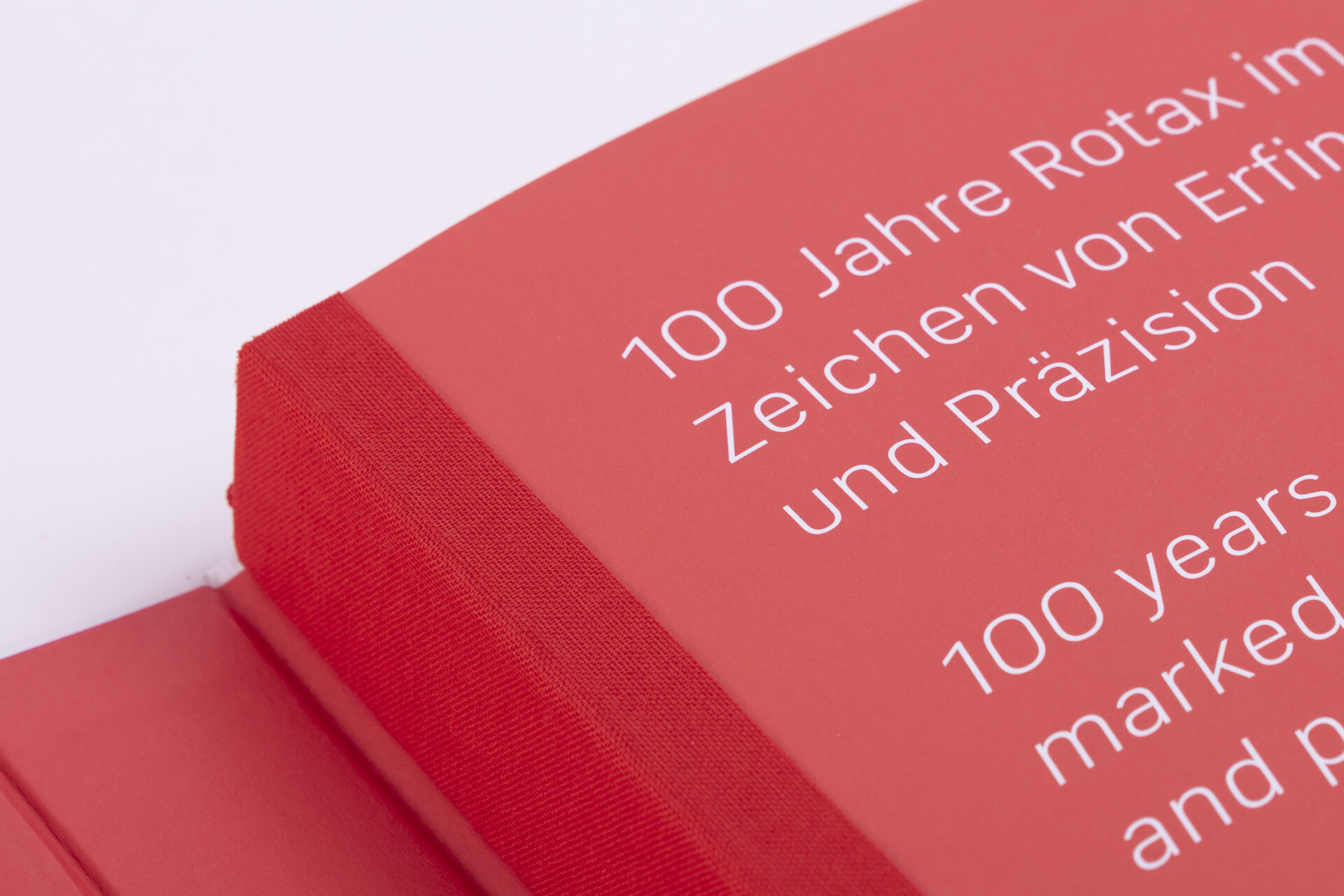 Der markanteste Eyecatcher – die Zahl 100 – wird durch Prägung in den Vordergrund gehoben. Weiters haben wir uns für eine der edelsten Arten der Bindung, nämlich für die Schweizer Brochure entschieden. Die Trennung von Buchteil und Rücken, verstärkt mit einem optisch passenden Falzband, weckt das Gefühl, hier etwas ganz Besonders in den Händen zu halten.